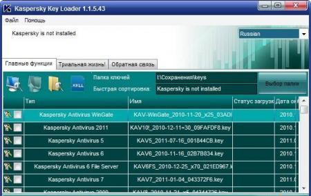 Kaspersky Key Loader - Утилита для поиска ключей к антивирусам Касперского. Программа сама находит в интернете ключи и выдаёт список антивирусов Касперского. Краткая инструкция по использованию: 1. Перед скачиванием архива отключите свой антивирус. 2. Запустив файл kkll.exe добавьте утилиту в исключения своего антивируса. 3. Нужно подождать немного пока утилита обработает данные. 4. После открытия главного окна программы, выбирите папку для сохранения ключей, затем в списке выбиритенужный Вам антмвирус (дважды щёлкнув левой кнопкой мыши). Ключик будет в указанной Вами папке.