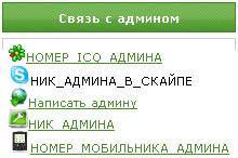 Функции: 1. При нажатии на ICQ откроется ajax icq онлайн. 2. При нажатии на E-mail (написать админу) откроется Яндекс.Почта, отправка сообщения. 3. При нажатии на ник админа откроется окно - отправить ЛC. 4. При нажатии на номер мобильника админа откроется отправка SMS (МТС, Билайн, Мегафон)