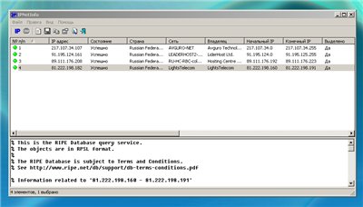 Программа, которая показывает информацию об IP адресе. Она позволяет показывать расширенную информацию, касающуюся страны, владельца домена, диапазона выделяемых IP адресов, контактную информацию и многое другое. Эта утилита будет полезна, например, когда необходимо узнать происхождение почты, полученной от неизвестного адресата. |