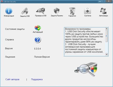USB Disk Security - инновационное программное обеспечение, которое обеспечивает вам 100% защиту от вредоносных программ и вирусов распространяемых через сменные носители (USB флешки, карты памяти, внешние жесткие диски и другие носители подключаемые через USB порт). Программа проста в обращении, нетребовательна к системным ресурсам и относится к категории "поставил и забыл". Программа полностью совместима с современными антивирусами, что позволяет обеспечить наибольшую защиту при использовании их вместе.