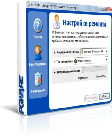 PCMedik - программа, предназначенная для настройки параметров и оптимизации работы Windows. Требуется лишь указать операционную систему, производителя процессора (Intel, AMD) и нажать кнопку "GO".
